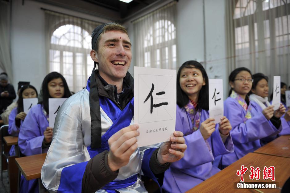 4月2日,天津文庙博物馆为来自天津理工大学的60余名新加坡、马来西亚、泰国三国留学生举办开笔礼,通过正衣冠、沐手净面、击鼓鸣志、祭孔行礼、开笔大礼等开笔礼主要仪程,让他们感受中华民族传统文化的独特魅力,增进外国留学生对中国传统文化的了解。开笔礼仪式古而有之,俗称“破蒙”,标志学童从此开始进入学习阶段,让学子认知孔子、感悟中华传统文化,让学子在凝重庄严的开笔礼仪式中,体验尊师重教的传统美德。 中新社发 佟郁 摄
