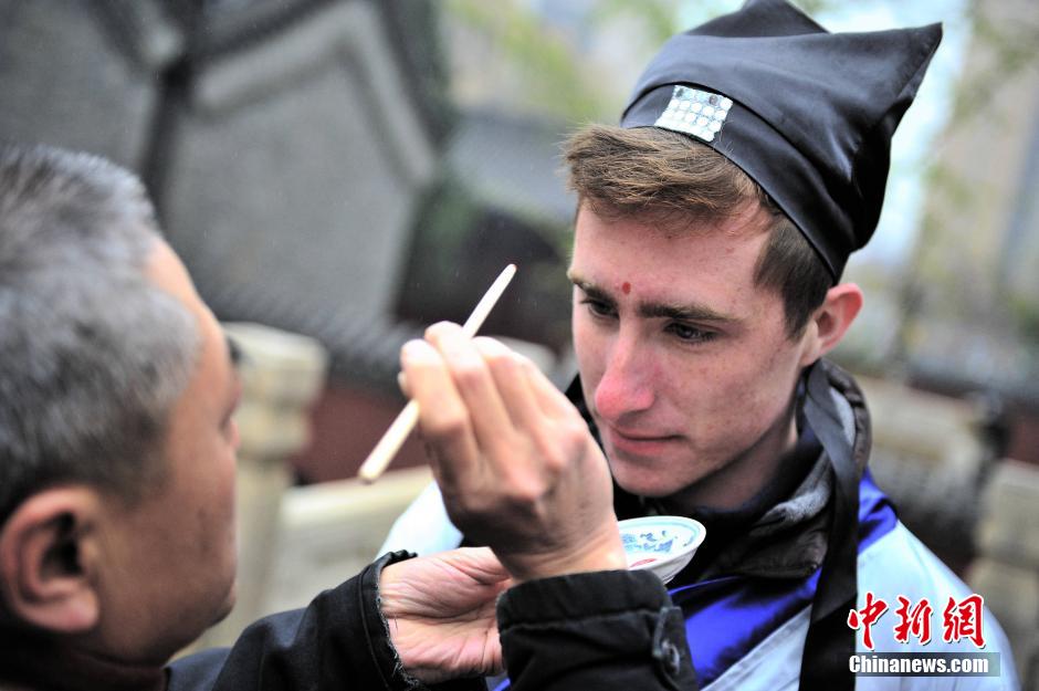4月2日,天津文庙博物馆为来自天津理工大学的60余名新加坡、马来西亚、泰国三国留学生举办开笔礼,通过正衣冠、沐手净面、击鼓鸣志、祭孔行礼、开笔大礼等开笔礼主要仪程,让他们感受中华民族传统文化的独特魅力,增进外国留学生对中国传统文化的了解。开笔礼仪式古而有之,俗称“破蒙”,标志学童从此开始进入学习阶段,让学子认知孔子、感悟中华传统文化,让学子在凝重庄严的开笔礼仪式中,体验尊师重教的传统美德。 中新社发 佟郁 摄