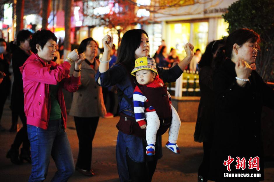 4月2日晚,兰州市民在街头跳“僵尸舞”引围观。僵尸舞,又叫佳木斯快乐舞步,是东北佳木斯一位退休老师创作。“僵尸舞”名字听起来吓人,但它却是如今盛行于社区的一种舞蹈。僵尸舞模仿的是迈克尔·杰克逊《战栗》里的动作。两臂前伸,左脚点地一下、右脚点地一下、双脚向前蹦一下、向后蹦一下,如此反复。 杨艳敏 摄