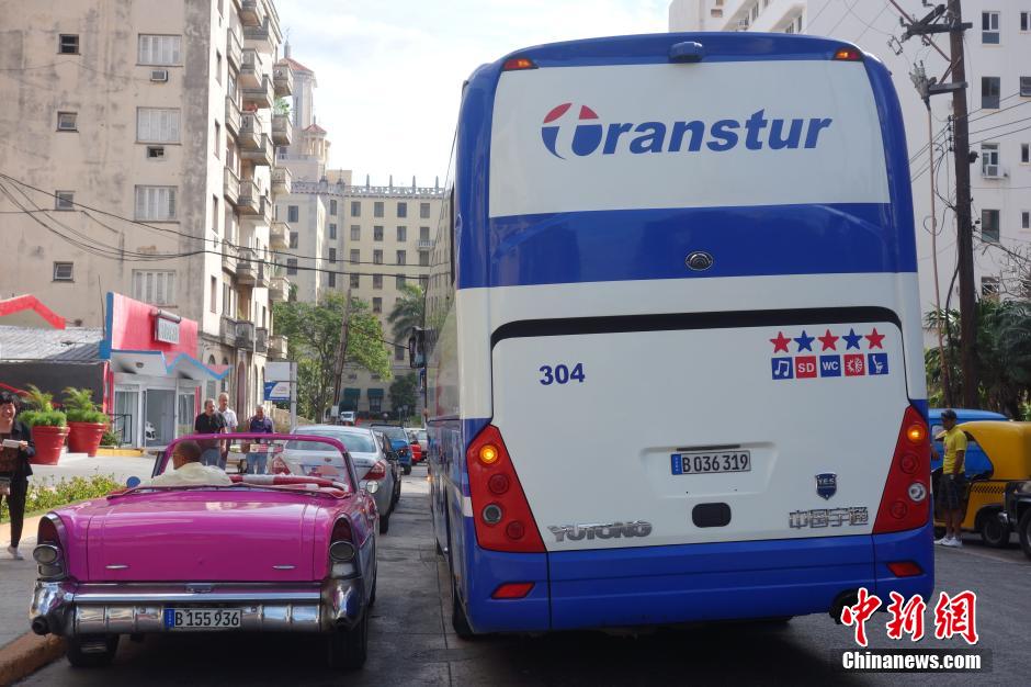 近年,古巴交通条件有了很大改善,交通便利。哈瓦那公交车和旅游车大多是中国产的“宇通”牌大客车。图为中国“宇通”牌大客车行驶在哈瓦那街头。中新社发 莫成雄 摄