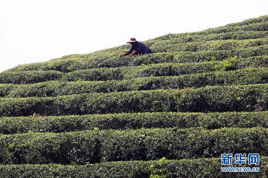 4月3日,菜农在福建省莆田市白云林场茶园采摘“明前茶”。 新华社发(林剑冰 摄)