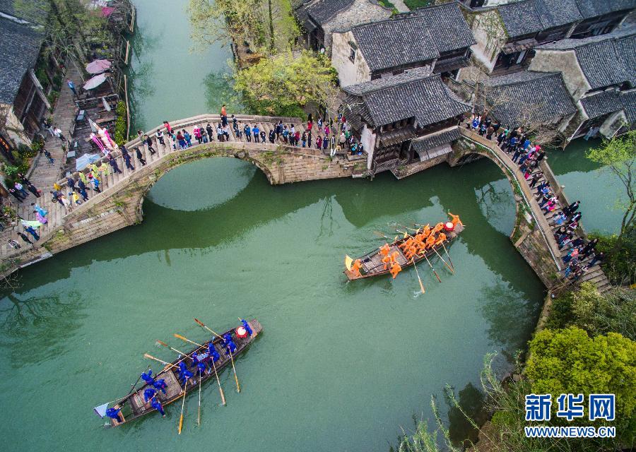 4月3日,乌镇水乡百姓参加“踏白船”的传统水上竞技活动。因其是在清明“香市”期间为祈祷蚕花丰收而举行,“踏白船”在民间又称“蚕龙舟”。当日,浙江省桐乡市乌镇开启了传统的“香市”盛会,为市民和游客呈现踏青游春、蚕花圣会、清明美食、民间戏曲等众多特色活动。让人们在春暖花开之际,感受江南古镇别样的民俗之美,弘扬和传承江南水乡的民间传统文化。据了解,乌镇“香市”源于盛唐时期,亦称乌镇烧香市,与杭州昭庆寺烧香市、苏州寒山寺烧香市并称江南“三大烧香市”。每年清明时节,烧“回头香”的香客纷至沓来,香火甚是旺盛。南宋时,乌镇“香市”规模空前盛大,同时,融入了清明时节当地农民祈求“蚕花廿四分”的祭奠活动,因此,乌镇“香市”也称乌镇“蚕花庙会”“蚕花圣会”。新华社记者 徐昱 摄