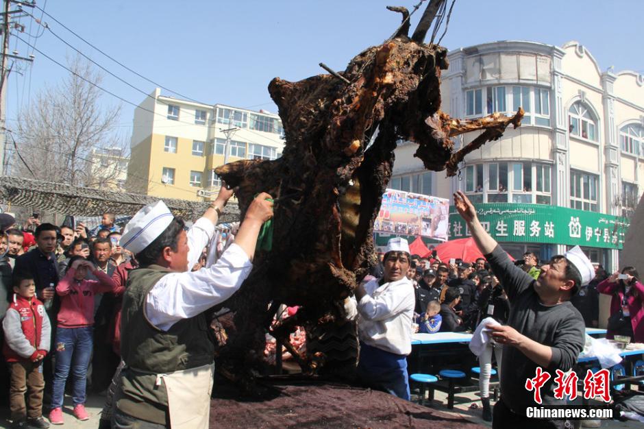 烤好的全驼徐徐放在预备好的巨大烤盘上。朱景朝 摄