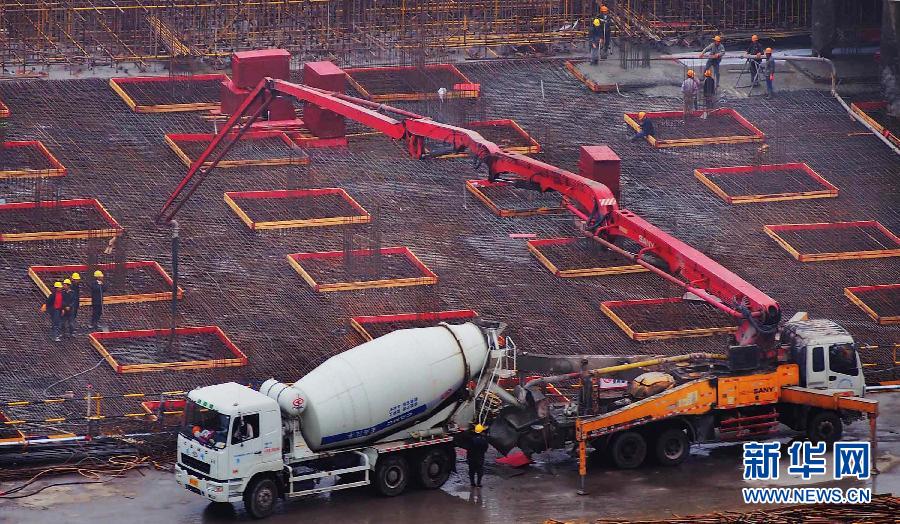 4月3日,在浙江省宁波市东部新城一建设工地,工人们操作大型混凝土机械冒雨浇筑一大型地下室的顶板。 新华社发(胡学军 摄)