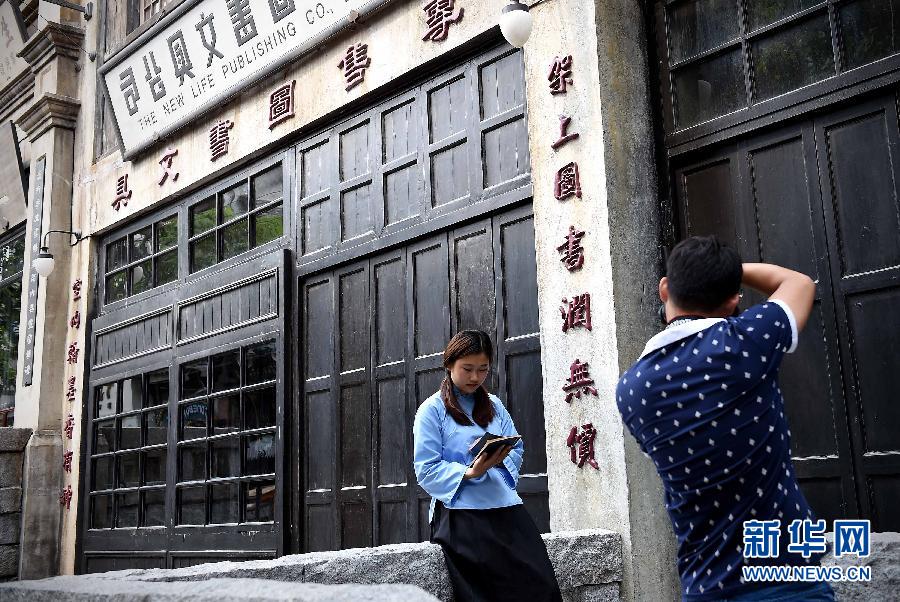 4月6日,游客身穿民国服饰在景区内拍照。当日是清明小长假的最后一天,许多游客来到海口冯小刚电影公社“1942民国街”,体验民国时期的老街风情。 新华社记者郭程摄