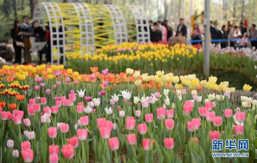 4月6日,游客在石家庄植物园欣赏郁金香。清明节期间,河北石家庄市植物园举办第三届荷兰郁金香文化节,展出120多个品种逾百万株郁金香。本届郁金香文化节特意从荷兰引进了“竞赛”、“幸福一代”等36个珍稀品种,花期预计将持续至5月。新华社记者王晓 摄