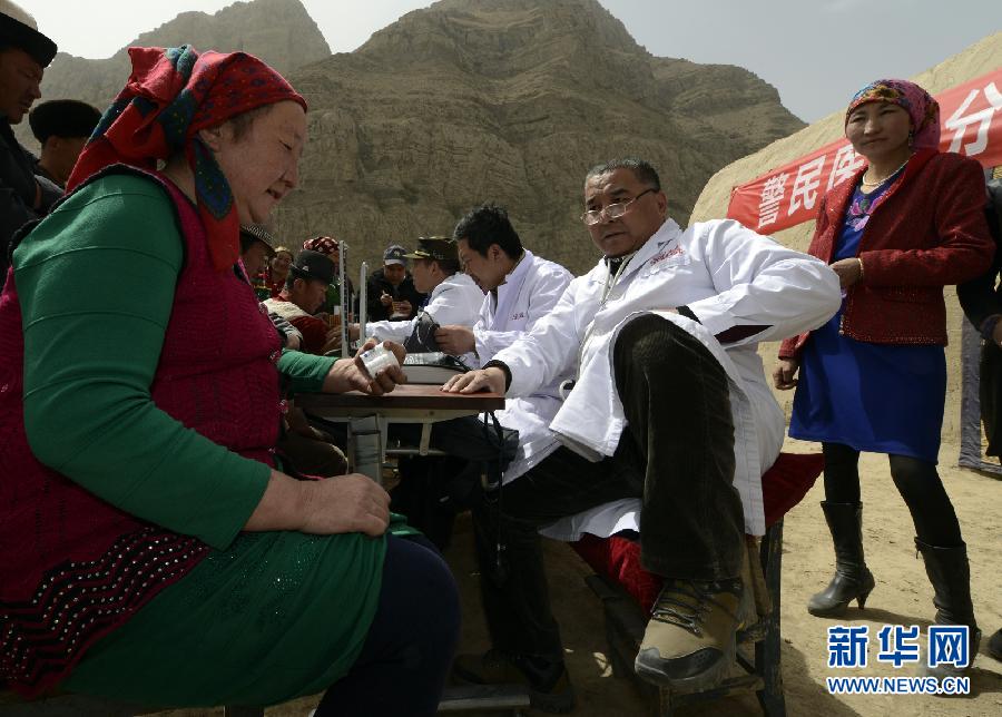 4月6日,新疆卫计委工作组医疗专家木合塔尔为牧民示范做退行性骨关节病相关检查时的动作要领。当日,新疆克孜勒苏柯尔克孜自治州边防支队恰提铁列克边防派出所医护人员与新疆卫计委工作组医疗专家组成“义诊小分队”,驱车近8个小时,前往距离县城100多公里的夏牧场,为牧区群众开展义诊活动,为他们讲解高寒地区易患疾病的预防知识、免费发放药品,受到牧民欢迎。新华社发 (刘丈国 摄)