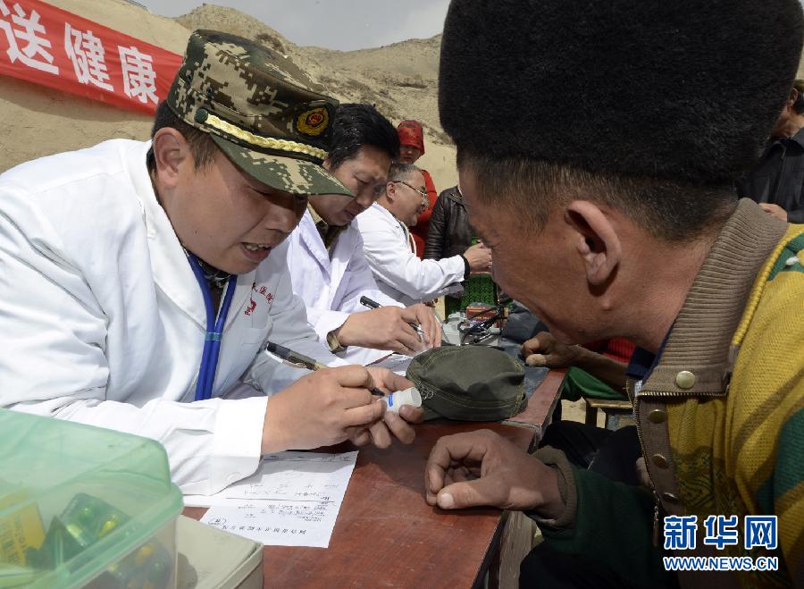 4月6日,边防军医王玉强(左一)为牧民讲解药品服用常识。当日,新疆克孜勒苏柯尔克孜自治州边防支队恰提铁列克边防派出所医护人员与新疆卫计委工作组医疗专家组成“义诊小分队”,驱车近8个小时,前往距离县城100多公里的夏牧场,为牧区群众开展义诊活动,为他们讲解高寒地区易患疾病的预防知识、免费发放药品,受到牧民欢迎。新华社发 (刘丈国 摄)