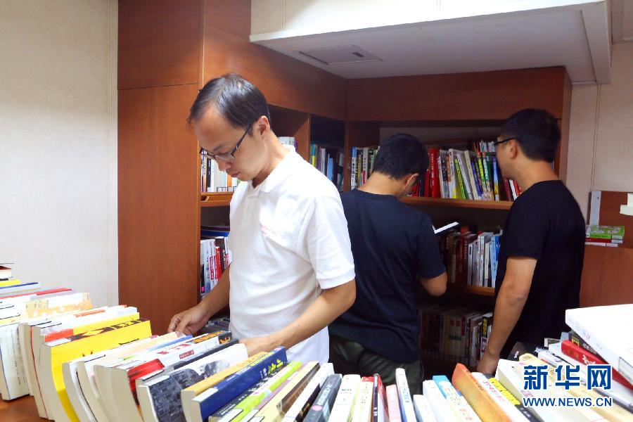 科考队员们在“雪龙”图书馆借阅书籍(2014年12月10日摄)。