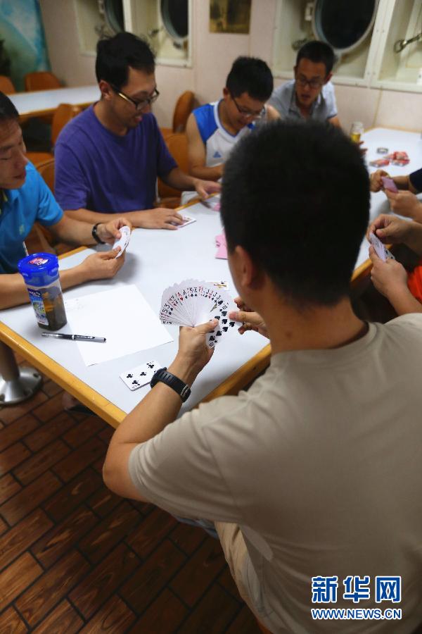 科考队员们在“雪龙”杯“五十K”扑克大赛上激烈角逐(3月28日摄)。