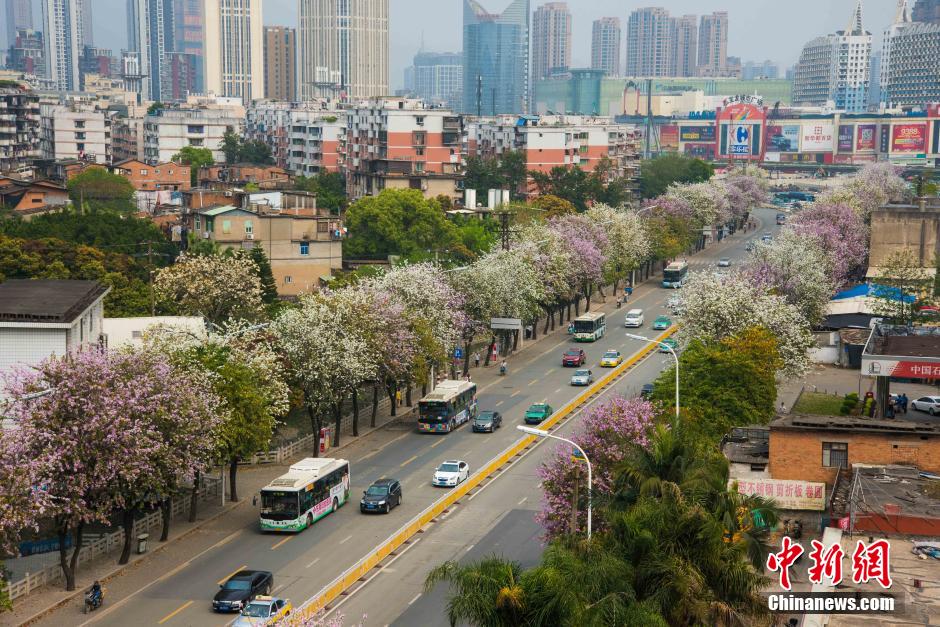 清明假期,福州街道两旁羊蹄甲花朵盛开。连日来,在福州工业路、温泉支路、朝阳路、高桥路等多条市区主干道,红白相间的花朵布满枝头,花香迎面扑来。李南轩 摄