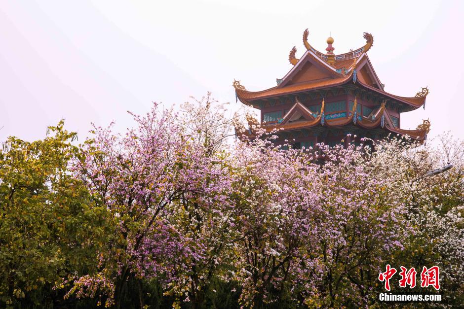 清明假期,福州街道两旁羊蹄甲花朵盛开。连日来,在福州工业路、温泉支路、朝阳路、高桥路等多条市区主干道,红白相间的花朵布满枝头,花香迎面扑来。李南轩 摄
