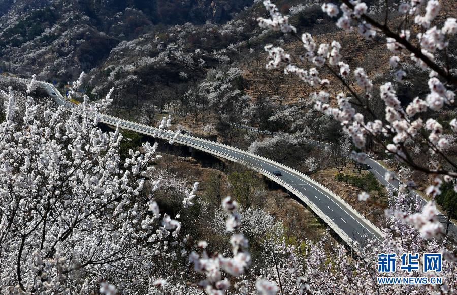 4月7日,汽车行驶在被山花围绕的北京怀柔山区111国道之中。眼下,111国道北京怀柔北部山区公路两旁杏花、山桃花竞相开放,车辆穿行,有赏心悦目之感。 新华社发(卜向东 摄)