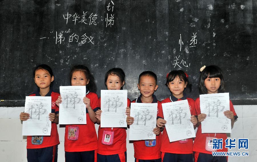 4月7日,海口市坡博实验学校的学生展示自己需要完成的“悌”单元家庭作业。当日,海南省海口市坡博实验学校为全校800多名小学生开展以“悌”为主题的中华美德教育,为学生讲解“悌”的含义,引导独生子女学习如何与表亲兄弟姐妹、同学处理好关系,为学生未来走出校园处理好人际关系打好基础。新华社发(杨冠宇摄)