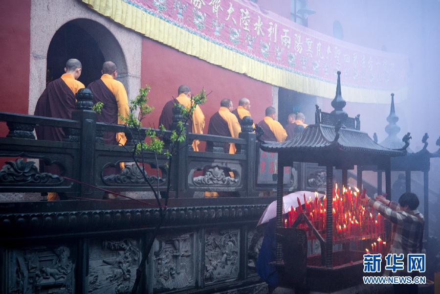 4月7日,九华山祇园禅寺内,僧人们在进行佛事活动。当日是农历二月十九,是佛教传统的观音会。佛教名山安徽九华山的寺庙在这一天都会举办各种法事,纪念观音菩萨诞辰,大量佛教信徒和游客也会在这一天来到九华山寺庙进行叩拜和游览。新华社记者郭晨摄