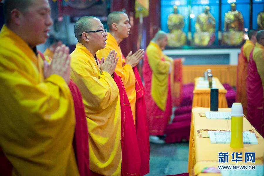4月7日,九华山祇园禅寺内,僧人们在进行佛事活动。当日是农历二月十九,是佛教传统的观音会。佛教名山安徽九华山的寺庙在这一天都会举办各种法事,纪念观音菩萨诞辰,大量佛教信徒和游客也会在这一天来到九华山寺庙进行叩拜和游览。新华社记者郭晨摄
