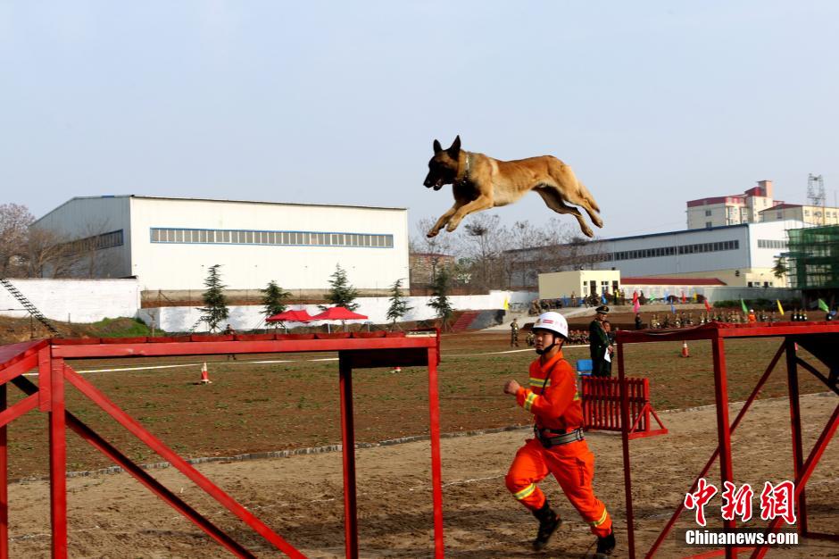 近日,河南省消防部队第二届搜救犬技术比武竞赛在洛阳举行,来自河南18个地市的66条犬只参加比赛。本届比赛共分为5个科目,分别是:单犬服从、箱体搜索、血迹搜索、废墟搜救、攀登障碍。图为搜救犬攀登障碍项目比赛现场。张雅君 摄