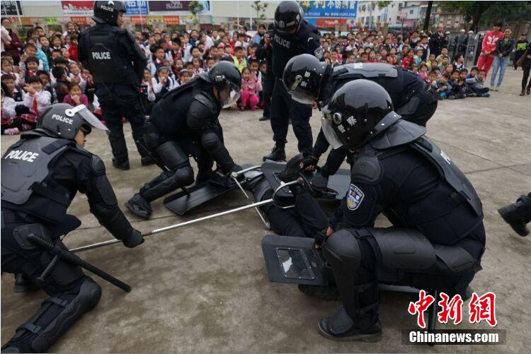 4月7日下午,广西柳州市河西小学举行“共筑平安·共享和谐”青少年维权岗服务月活动。柳州市综治委、团市委及市公安局联合特警支队进行反恐操演、警务装备展示、普及交通安全知识等。据悉,维权岗服务致力于青少年维权和保障工作,关心学生们的健康成长。图为反恐演练现场。莫小华 摄