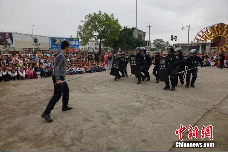 4月7日下午,广西柳州市河西小学举行“共筑平安·共享和谐”青少年维权岗服务月活动。柳州市综治委、团市委及市公安局联合特警支队进行反恐操演、警务装备展示、普及交通安全知识等。据悉,维权岗服务致力于青少年维权和保障工作,关心学生们的健康成长。图为反恐演练现场。莫小华 摄