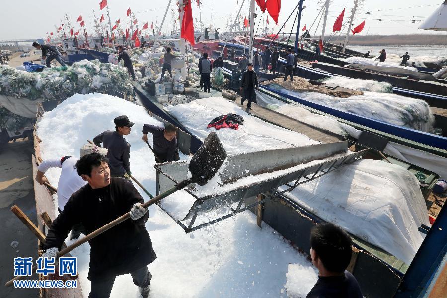 4月8日,渔民在江苏连云港市赣榆区青口港渔业码头给渔船添加冰块,为出海春捕做准备。随着沿海渔业生产进入黄金季节,江苏连云港市赣榆区的渔民纷纷抓紧时间整理修补渔具,准备保鲜冰块、渔船油料及各种生活用品,做足准备赶渔汛。新华社发(司伟 摄)