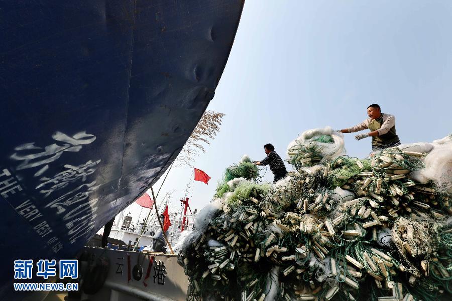 4月8日,渔民在江苏连云港市赣榆区青口港渔业码头将渔具装船,为出海春捕做准备。随着沿海渔业生产进入黄金季节,江苏连云港市赣榆区的渔民纷纷抓紧时间整理修补渔具,准备保鲜冰块、渔船油料及各种生活用品,做足准备赶渔汛。新华社发(司伟 摄)