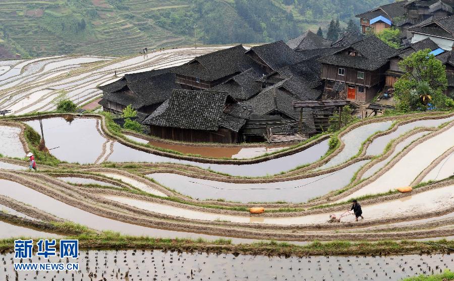 4月8日,贵州省黔东南州从江县加榜乡一村民在使用多功能微耕机犁田。近年来,体积小、功能多,适合山区梯田耕作的微耕机已逐渐取代牲畜,成为贵州黔东南山区的春耕主力。 新华社发(乔启明 摄)