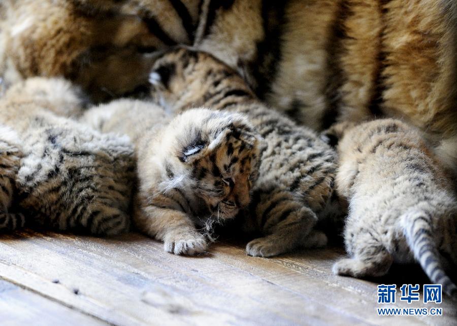 4月8日,在沈阳怪坡东北虎园,虎仔依偎在妈妈身旁。 新华社发(张文魁 摄)