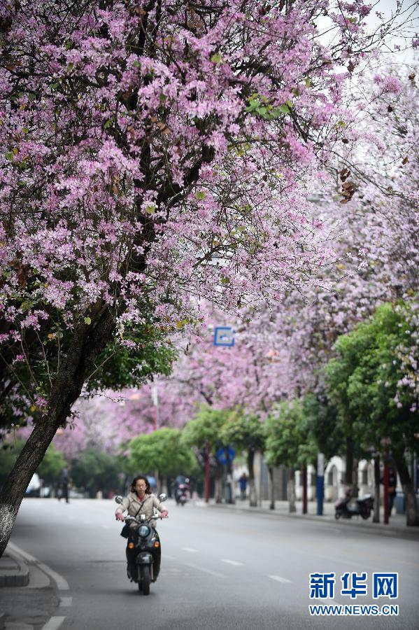 4月8日,市民骑车经过开满洋紫荆的柳州市弯塘路。时下,广西柳州市20万株紫荆竞相绽放,数条街道成为花海。近年来,柳州市开展花园城市建设,已绿化改造60条城市道路、13个公园、14个街心公园、12座石山以及立交桥、柳江沿岸、铁路沿线等,累计种植洋紫荆、杜鹃、木棉、夹竹桃等60多个品种560多万株植物。新华社记者 李斌 摄