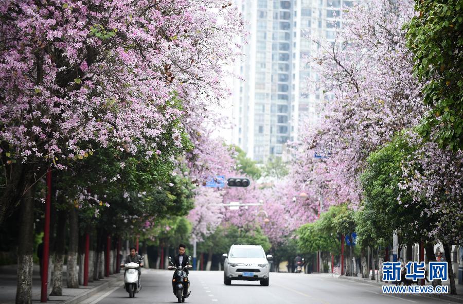 4月8日,车辆经过开满洋紫荆的柳州市弯塘路。时下,广西柳州市20万株紫荆竞相绽放,数条街道成为花海。近年来,柳州市开展花园城市建设,已绿化改造60条城市道路、13个公园、14个街心公园、12座石山以及立交桥、柳江沿岸、铁路沿线等,累计种植洋紫荆、杜鹃、木棉、夹竹桃等60多个品种560多万株植物。新华社记者 李斌 摄