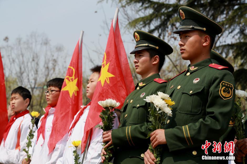 图为解放军官兵和台儿庄当地学生向烈士墓敬献鲜花。梁犇 摄