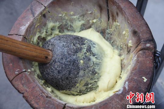 图为正在将土豆制作成搅团。刘玉桃 摄