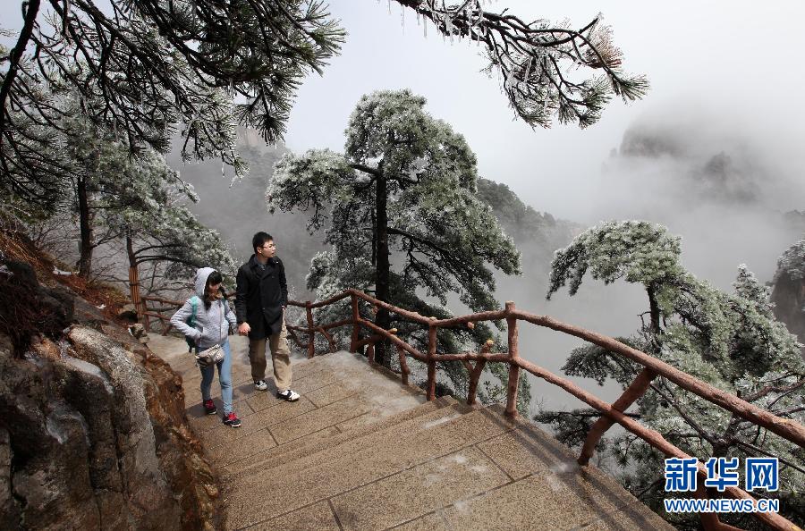 这是4月8日拍摄的雪后黄山。近日,安徽省黄山风景区迎来四月雪,雪后的山峦、树木更显秀美。 新华社发(施亚磊 摄)