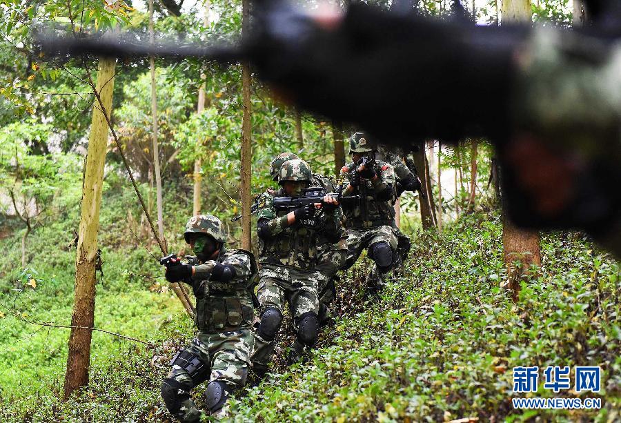4月8日,一支特战分队在丛林练兵中搜索目标。四月的南国深山,天气闷热、蛇虫盛行,正值练兵好时节。当日,武警广西边防总队训练基地将两支特战分队带至野外陌生地域,开展以边境搜捕毒贩为背景的实战化对抗练兵,砥砺特战队员跟踪侦察、丛林搜捕、长途奔袭、战术协同等遂行多样化任务硬功。新华社发(李杭 摄)