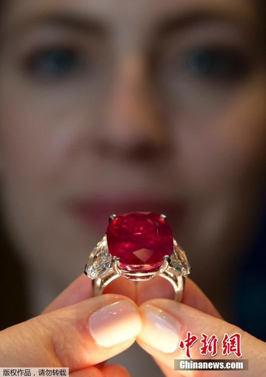 4月8日,在英国伦敦,一名苏富比拍卖行的工作人员在媒体预展上展示一枚缅甸红宝石。该红宝石为25.59克拉,估价为1200万至1800万美元,将于5月在瑞士日内瓦苏富比拍卖会上亮相。
