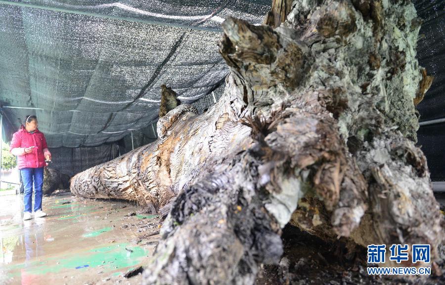 这是4月9日在湖北省咸丰县小村乡拍摄的巨型金丝楠乌木。湖北省咸丰县小村乡在2014年9月一次洪水过后,于河道中发现三根罕见的巨型金丝楠乌木。这三根金丝楠乌木直径均达1米以上,有两根长约27米,一根长约18米。目前,当地已搭建遮阳棚为金丝楠乌木遮光挡雨。据介绍,金丝楠乌木数量稀少,有极高的科研价值和经济附加值。 新华社发(杨顺丕 摄)