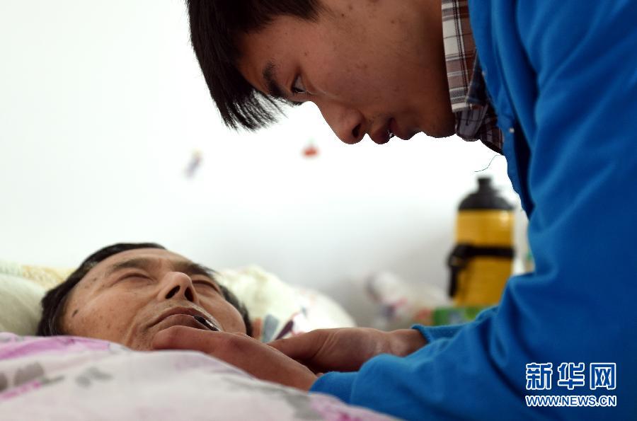 4月8日,郭世俊在出租房里给父亲刮脸。一间狭小的出租房、两张床、几件简陋的家具和电器,这就是21岁大学生郭世俊和父亲临时的“家”。2012年,郭世俊的父亲郭益山因意外事故造成高位截瘫,当时正在安徽六安市郊区读高中的郭世俊把患病的母亲托付给年迈的爷爷照顾,自己带上父亲在学校附近租房,边读书边照顾父亲。2014年,郭世俊考入位于安徽省六安市的皖西学院,带着父亲一起开始大学生活。除了学业,郭世俊把自己的精力放在照顾父亲上,每天给父亲翻身、按摩、喂饭,是他的“必修课”。郭世俊说,艰苦的生活让他变得更加成熟,来自学校师生和爱心人士的关爱也让他感受到社会的温暖。谈起未来,郭世俊说,以后不管到了哪里,都要把父亲带在身边,照顾他一辈子。新华社记者刘军喜摄