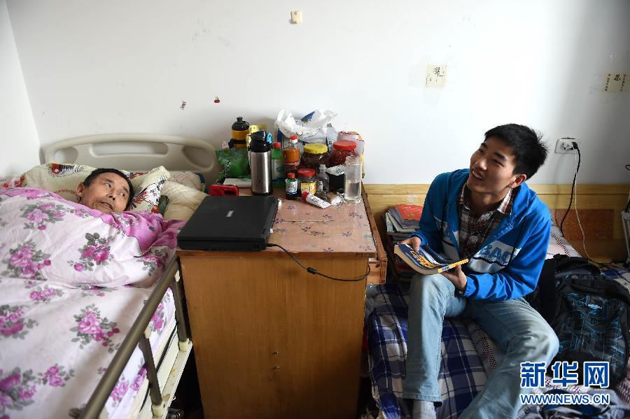 一间狭小的出租房、两张床、几件简陋的家具和电器,这就是21岁大学生郭世俊和父亲临时的“家”。2012年,郭世俊的父亲郭益山因意外事故造成高位截瘫,当时正在安徽六安市郊区读高中的郭世俊把患病的母亲托付给年迈的爷爷照顾,自己带上父亲在学校附近租房,边读书边照顾父亲。2014年,郭世俊考入位于安徽省六安市的皖西学院,带着父亲一起开始大学生活。除了学业,郭世俊把自己的精力放在照顾父亲上,每天给父亲翻身、按摩、喂饭,是他的“必修课”。郭世俊说,艰苦的生活让他变得更加成熟,来自学校师生和爱心人士的关爱也让他感受到社会的温暖。谈起未来,郭世俊说,以后不管到了哪里,都要把父亲带在身边,照顾他一辈子。新华社记者刘军喜摄