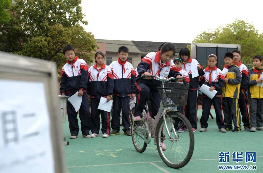4月9日,浙江省余姚市黄家埠镇横塘小学的学生在参加自行车骑行“考试”。为提升学生的交通安全意识,浙江省余姚市横塘小学对该校年满12周岁、准备骑自行车上学的学生进行自行车骑行实践“考试”。“考试”是在校方对学生进行交通图标、行车规范等交通安全理论辅导后进行。骑行“考试”内容包括上下车动作、直角转弯、过窄道、过颠簸地块、S线行车、紧急停车等,“考试”合格的学生将获得校方颁发的自行车“驾照”。 新华社发 张辉 摄 图片来源:新华网