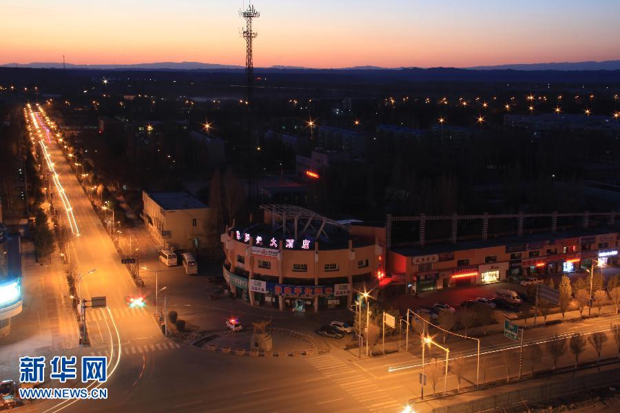 4月10日拍摄的新疆生产建设兵团第七师一三七团夜晚景色。位于中哈边境的新疆生产建设兵团第七师一三七团和克拉玛依市乌尔禾区每年在旅游、文化、民生等方面投资上千万元,联手共建边陲“生态旅游文化新城”。新华社发(张西安 摄)