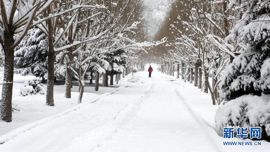 4月12日,市民在内蒙古克什克腾旗经棚镇公园内散步。受冷空气影响,内蒙古克什克腾旗4月11日下午开始迎来降雪天气。 新华社发(孙国树 摄)
