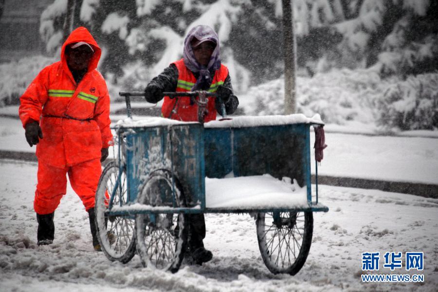 4月12日,内蒙古赤峰市新城区环卫工人在积雪中行走。当日,受冷暖空气交互影响,内蒙古赤峰市遭遇雨夹雪天气,给市民出行带来不便。 新华社发(李富 摄)