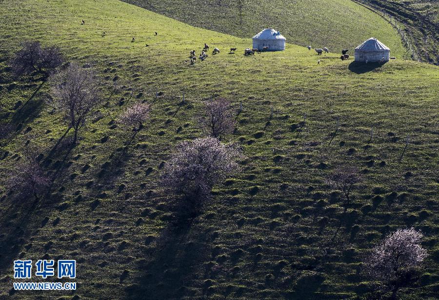 4月11日,新疆新源县吐尔根乡杏花谷的野杏花在牧民的毡房旁盛开。当日,新疆新源县迎来第二届吐尔根“杏花竞春节”。山染新绿、花开沟谷,杏花谷中的野杏树次第开放,游人在大好春光中尽享新疆“野杏”之美,一些富有当地特色的民俗活动也为当日杏花节活动增色不少。新华社记者 江文耀 摄