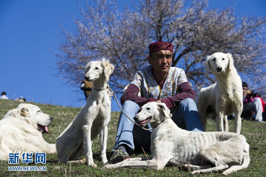 4月11日,一位牧民在新疆新源县第二届吐尔根“杏花竞春节”展示他的猎狗。当日,新疆新源县迎来第二届吐尔根“杏花竞春节”。山染新绿、花开沟谷,杏花谷中的野杏树次第开放,游人在大好春光中尽享新疆“野杏”之美,一些富有当地特色的民俗活动也为当日杏花节活动增色不少。新华社记者 江文耀 摄