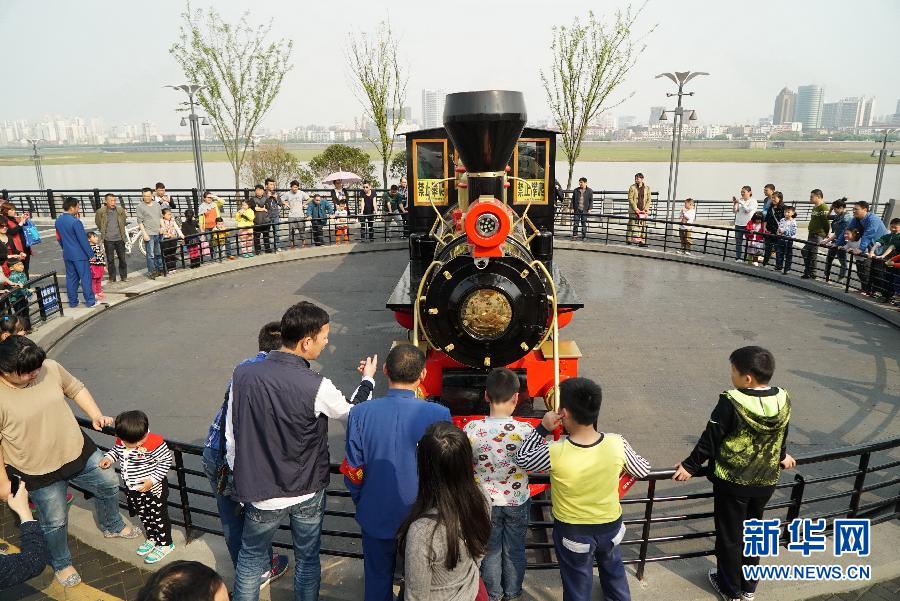 4月12日,市民在凤凰洲市民公园观看小火车调头的过程。江西南昌牛行火车站建成于1916年,是江西省第一条自办铁路南浔铁路的终点站。随着时代变迁,曾经繁忙的牛行火车站逐渐冷落并被弃用,车站也成了破败的货场并最终被拆毁。为了记录历史,当地政府将牛行火车站按原貌重建,并以此为基础,沿着赣江修造了约3.7公里的凤凰洲市民公园,成为市民休闲的好去处。新华社记者周密摄