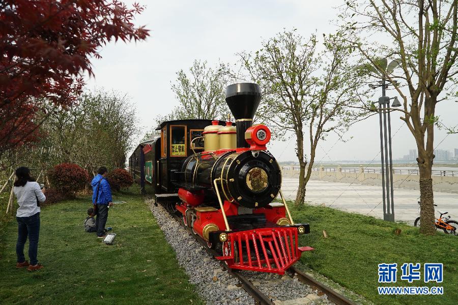4月12日,小火车行驶在凤凰洲市民公园内。江西南昌牛行火车站建成于1916年,是江西省第一条自办铁路南浔铁路的终点站。随着时代变迁,曾经繁忙的牛行火车站逐渐冷落并被弃用,车站也成了破败的货场并最终被拆毁。为了记录历史,当地政府将牛行火车站按原貌重建,并以此为基础,沿着赣江修造了约3.7公里的凤凰洲市民公园,成为市民休闲的好去处。新华社记者周密摄