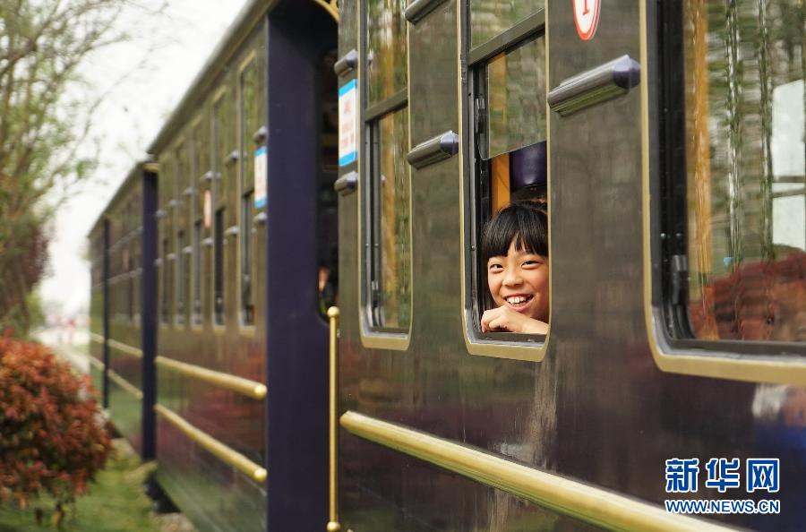 4月12日,一名儿童在凤凰洲市民公园内乘坐小火车游玩。江西南昌牛行火车站建成于1916年,是江西省第一条自办铁路南浔铁路的终点站。随着时代变迁,曾经繁忙的牛行火车站逐渐冷落并被弃用,车站也成了破败的货场并最终被拆毁。为了记录历史,当地政府将牛行火车站按原貌重建,并以此为基础,沿着赣江修造了约3.7公里的凤凰洲市民公园,成为市民休闲的好去处。新华社记者周密摄