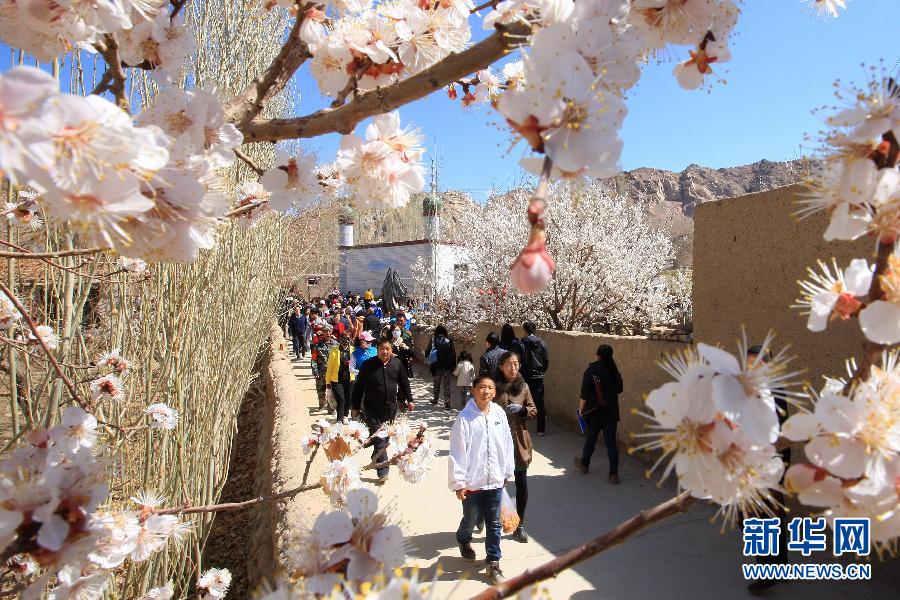 4月11日,游客在新疆哈密市天山乡石城子村赏杏花。新华社发(普拉提 摄)