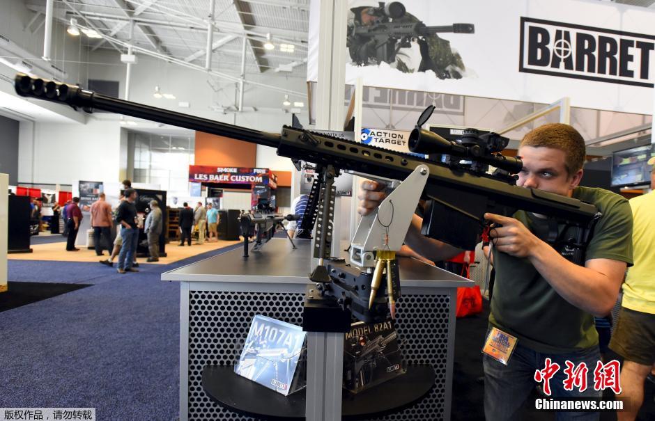 当地时间2015年4月11日,美国田纳西州纳什维尔,美国全国枪支协会(NRA)第144届年度枪械展在当地举行。此次年会和枪械展持续2天,预计将吸引超过7万人到场。图为民众体验巴雷特50口径狙击步枪。
