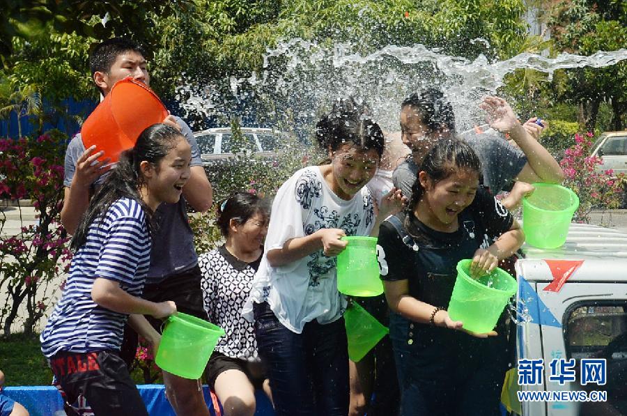 4月12日,人们在云南省德宏傣族景颇族自治州芒市泼水狂欢。当日是云南省德宏傣族景颇族自治州泼水节,数万名当地群众和游客在芒市互相泼水,互祝吉祥、幸福、健康。泼水节是傣族人民辞旧迎新的传统节日。新华社记者胡超摄