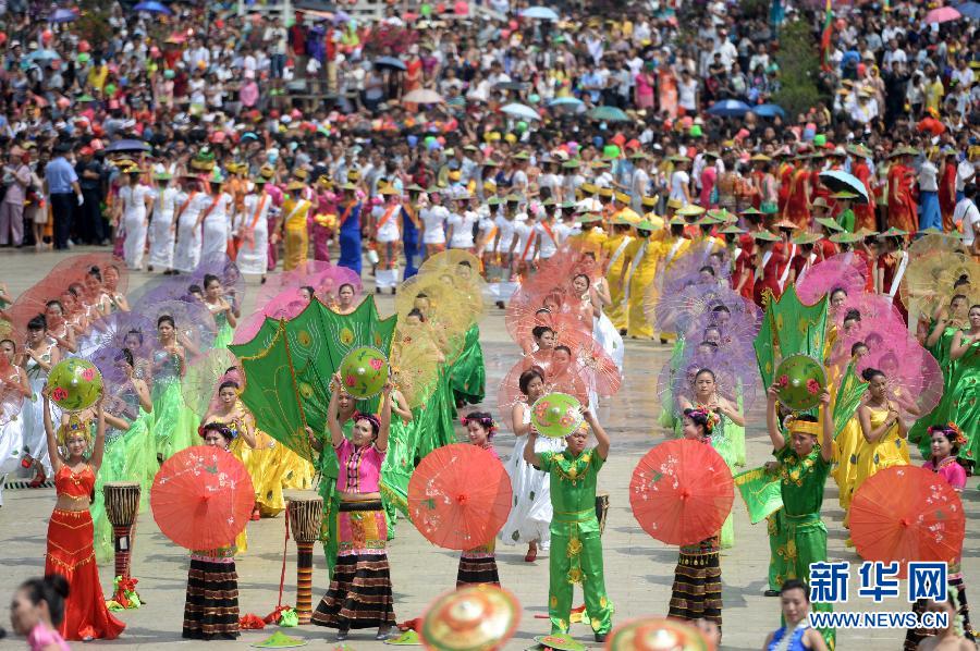 4月12日,当地群众在中国·德宏2015国际泼水狂欢节开幕式上表演舞蹈。当日是云南省德宏傣族景颇族自治州泼水节,数万名当地群众和游客在芒市互相泼水,互祝吉祥、幸福、健康。泼水节是傣族人民辞旧迎新的传统节日。新华社记者胡超摄